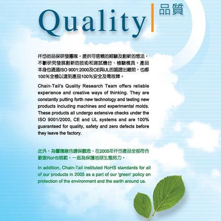 此外,為響應(yīng)綠色環(huán)保觀(guān)念,在2005年仟岱產(chǎn)品全部符合歐盟ROHS規(guī)范,一起為保護(hù)地球生態(tài)努力。
